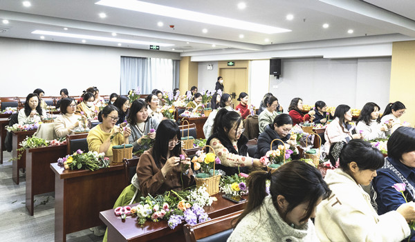 活動(dòng)現(xiàn)場,馥郁芬芳、氣氛熱烈,五彩繽紛的花束將現(xiàn)場裝扮的浪漫溫馨。專業(yè)花藝?yán)蠋煘榇蠹以敿?xì)講解了插花的基本技巧和藝術(shù)審美要點(diǎn),并從花材選擇、插花的空間結(jié)構(gòu)框架、整體效果和細(xì)節(jié)點(diǎn)綴等環(huán)節(jié)進(jìn)行現(xiàn)場指導(dǎo),大家熱情高漲,將紫羅蘭、洋甘菊、玫瑰、滿天星等花卉修剪后盡情發(fā)揮、精巧構(gòu)思,在輕松歡快的氛圍中,經(jīng)過一個(gè)多小時(shí)的精心制作,一盆盆凝聚著大家對(duì)美的追求和對(duì)生活熱愛的插花作品呈現(xiàn)在活動(dòng)現(xiàn)場,大家紛紛拍照留念,記錄這些美好的瞬間。
