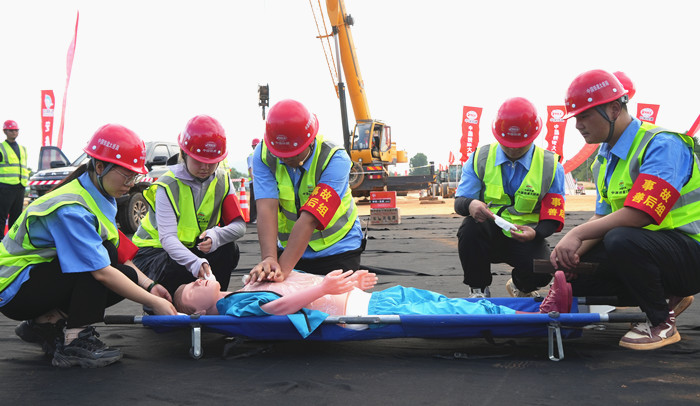 演練以 YQB1 標(biāo)施工現(xiàn)場為場景,模擬了兩類施工常見險(xiǎn)情:一是起重機(jī)械作業(yè)時(shí)突發(fā)故障,吊物意外墜落導(dǎo)致工人受傷;二是施工人員在高溫環(huán)境下作業(yè),突發(fā)中暑癥狀。演練指令下達(dá)后,各應(yīng)急救援小組迅速啟動(dòng)響應(yīng)機(jī)制,嚴(yán)格依照既定分工展開行動(dòng) ,從現(xiàn)場警戒、傷員初步救治,到信息上報(bào)、醫(yī)療轉(zhuǎn)運(yùn),整個(gè)過程銜接緊密、有條不紊。各小組之間高效配合、協(xié)同作戰(zhàn),最終在預(yù)定時(shí)間內(nèi)圓滿完成全部救援任務(wù),充分展現(xiàn)出項(xiàng)目團(tuán)隊(duì)良好的應(yīng)急處置能力和默契的團(tuán)隊(duì)協(xié)作精神。